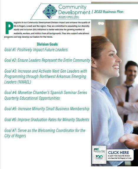 Programs in our Community Development division impact and enhance the quality of life in Rogers, Lowell and the region. They are committed to expanding our diversity, equity and inclusion (DEI) initiatives to better welcome the growing number of residents, workers, and visitors from all backgrounds. They also support educational programs and help develop our leaders for the future.