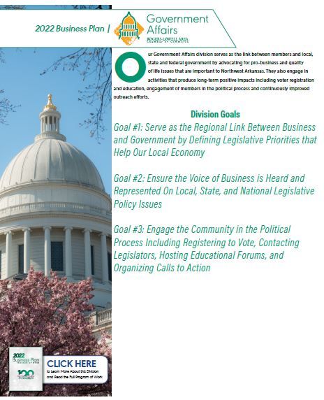 Our Government Affairs & Advocacy division serves as the link between members and local, state and federal government by advocating for pro-business and quality of life issues that are important to Northwest Arkansas. They also engage in activities that produce long-term positive impacts including voter registration and education, engagement of members in the political process and continuously improved outreach efforts.