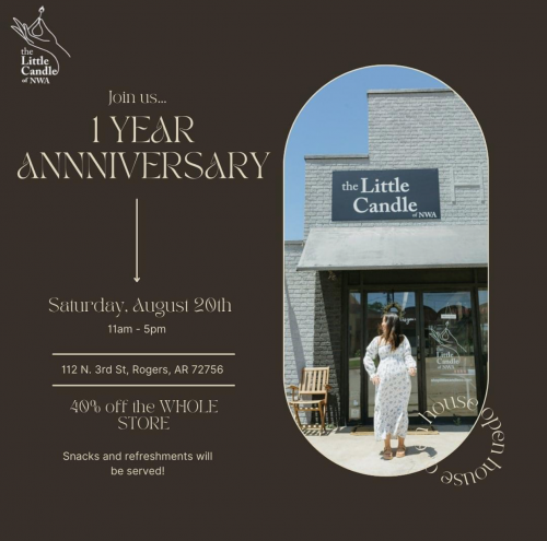 The Little Candle NWA is celebrating their first year anniversary on Saturday, August 20, 11 a.m. – 5 p.m. at 112 N 3rd Street, in Downtown Rogers. They are serving refreshments and offering a storewide sale with savings of 40% off all products.