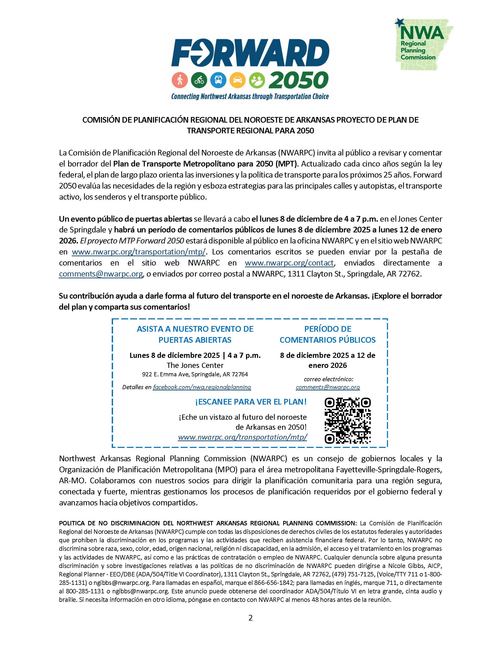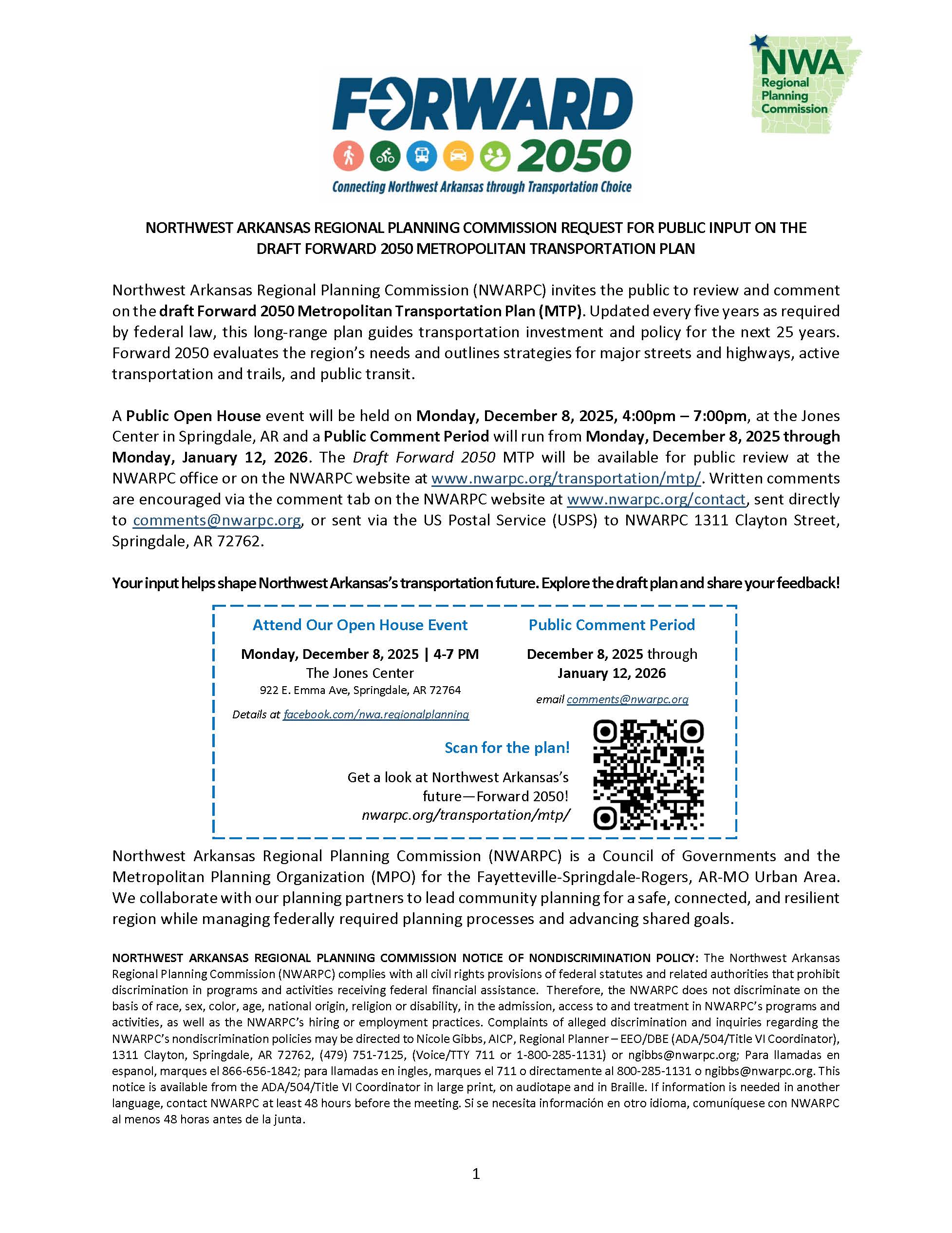 NORTHWEST ARKANSAS REGIONAL PLANNING COMMISSION REQUEST FOR PUBLIC INPUT ON THE DRAFT FORWARD 2050 METROPOLITAN TRANSPORTATION PLAN